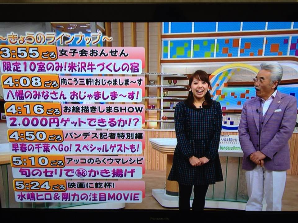 昨日は 日経新聞電子版の件で盛り上がってしまいましたが マスコミつながりで今日は宮城の放送局、ミヤギテレビ「OH!バンデス」のコーナー「女子会おんせん」で紹介していただいた件を!