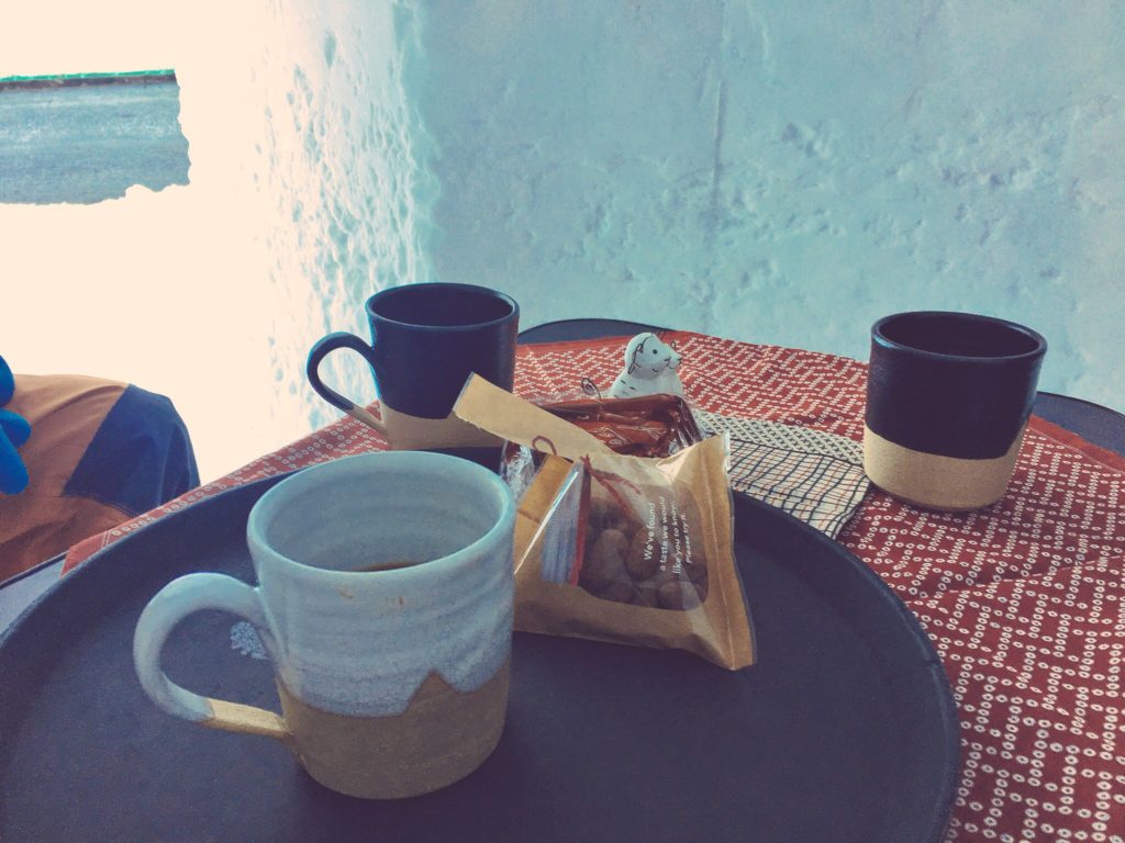 帰ってきた翌日にはーーー 屋根の雪下ろしや建物周りの雪片付けをしてくれたスタッフ達と アマンドショコラ や トリュフ を食べながら かまくら でコーヒータイムしたんだよーー♪