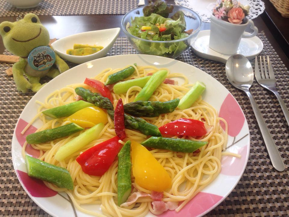 そうです。冬は 豆もやしのピラフやパスタを紹介していましたが 昨日友達の学習塾スクールIEを経営している 遠藤りゅうちゃんのfacebook投稿で ぼぬーるさんのパスタが 摘みたてアスパラガスのペペロンチーノに なっていることを知りました~!(笑)