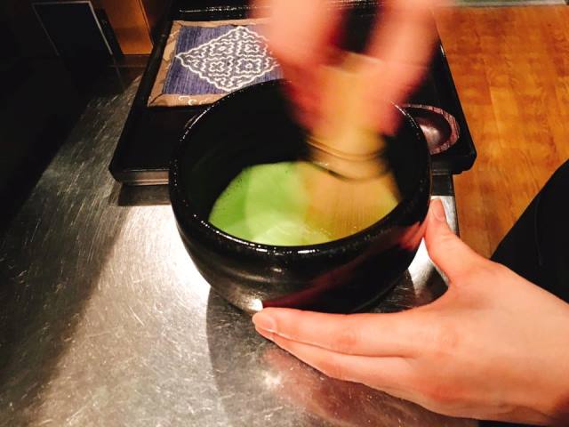 ティータイムしようって お互いに お互いのお茶を点てて わたしのお茶碗は今回の器、益子焼。黒のほう♪ かえでさんは米沢焼水野先生のお茶碗♪