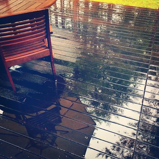 今日の お宿のラウンジからの眺め ウッドデッキに映るすみれガーデンの風景。