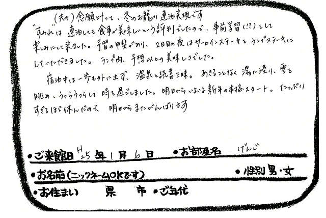 冬の2泊、G様より思い出エピソード「宿泊中は一歩も外に出ず、温泉と読書三味」2人の冬のお籠り連泊プラン♪