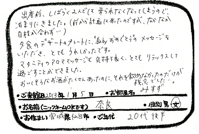 宮城県仙台市よりお越しの 奈良様より思い出エピソード「マタニティのアロママッサージも気持ち良く」ご夫妻の産前旅行プラン♪
