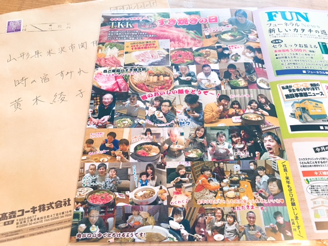 高森さんご夫妻の会社は新潟にあり「高森コーキ」さんという 主に給油・貯油施設や住宅の環境整備のためのお手伝いをなさっている企業さんです。ご夫妻とは9年前からご縁をいただいておりますが 会社の社員さんたち全員に 米沢牛のすき焼き肉を お届けするお手伝いをさせていただいたのは 今回で2回目。前回もニュースレターに紹介してもらっていたのですが 今回も2月号に社員さん達のたくさんの笑顔とともにお宿にも届けられたのですーーー!!!