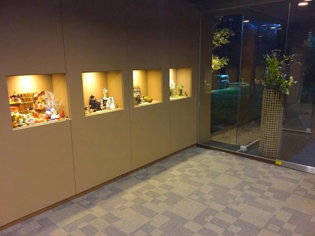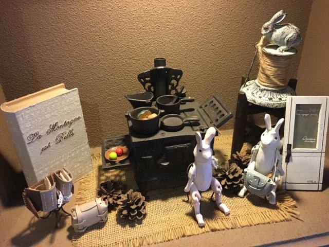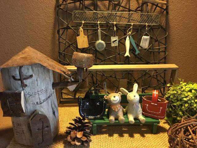 お宿の玄関のすぐ脇に 飾り棚があるんです。 シーズン毎にテーマを替えて お客さまに楽しんでいただいている小物やオブジェ。最近は春を楽しみにしている 森の住人たちがお家の中で寛いでいます(笑)