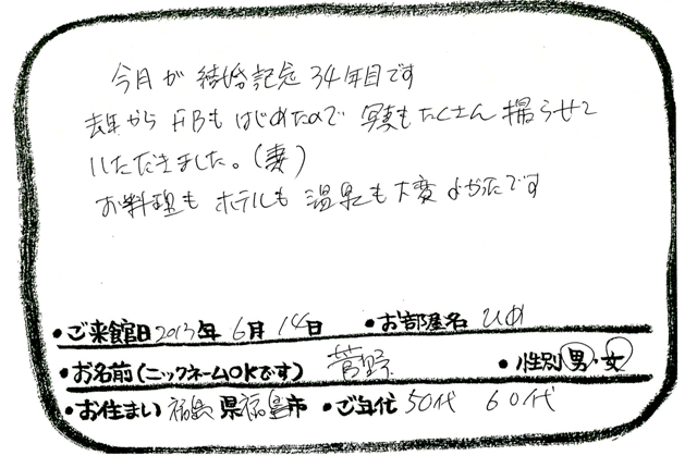 福島県福島市菅野様より「お料理もホテルも温泉も大変良かったです」結婚33周年記念旅行♪