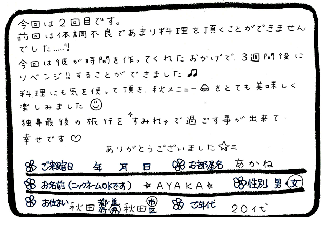 「独身最後の旅行をすみれで過ごすことが出来て幸せ」3週間後にリベンジの婚前旅行♪秋田県秋田市のAYAKA様より