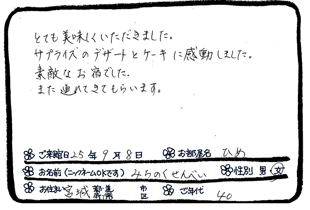 「サプライズのデザートとケーキに感動」お2人の出会い記念日温泉旅行♪宮城県のみちのくせんべい様より