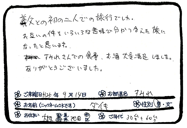 「義父との初の二人での旅行」男同士の分かり合えた旅☆大阪府池田市のダイキ様より