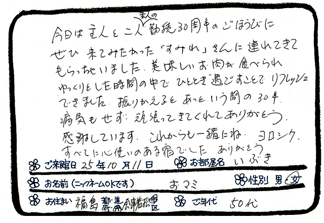 「美味しいお肉が食べられゆっくりとした時間」ご主人の勤続30周年旅行♪福島県会津若松市よりお越しの 50代 おマミ 様より