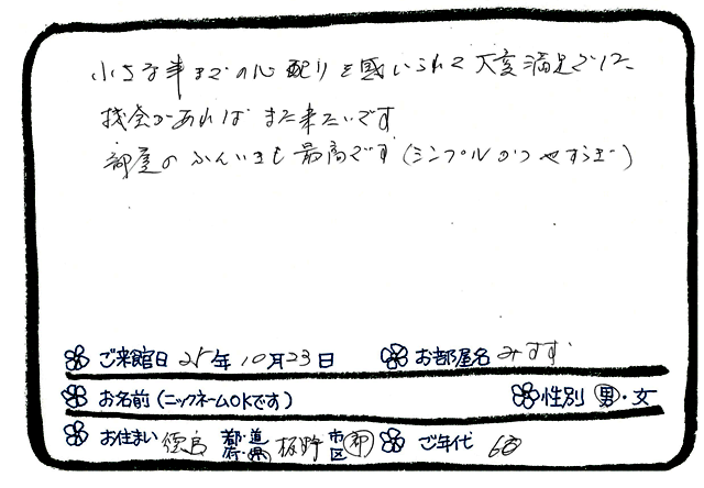 さて、今日はお客様達がご滞在中に書いてくださった 手書きの素敵なメッセージのご紹介ですが ご旅行の前から お宿でのご滞在を楽しみにして下さるお客様に 「良かった」「いい思い出ができた」「ゆっくりできた」と お役に立てたことが本当にうれしく感じられます♪ その時の光景を思い浮かべながら 後日お返事も書かせていただいておりますが もしよろしければ 各ご紹介ページでテキスト文もご覧いただけましたら嬉しいです。ご年代も様々なご夫妻のご感想です♪