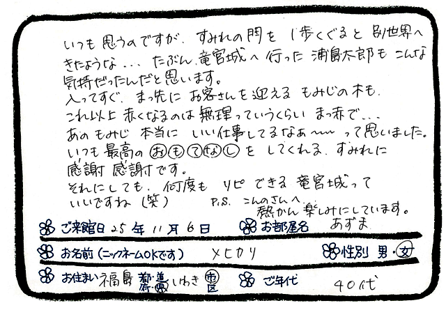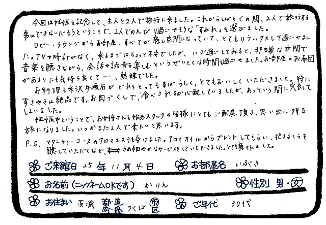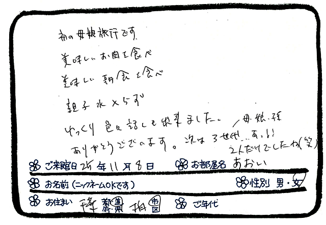 今日は お宿にお越しいただいたお客様がご滞在中に書いてくださった旅の思い出メッセージ、ご感想をご紹介させていただきます♪
