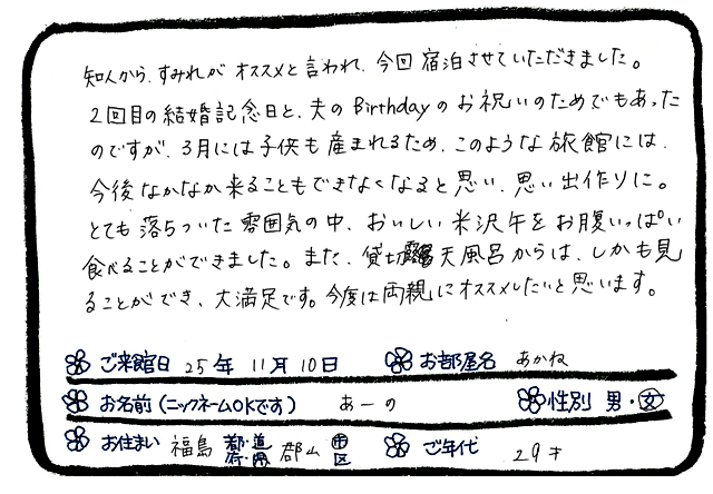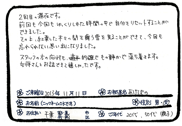 お客様に教えていただくことがすごく多くて、このお仕事をさせていただく上で何より光栄なことなのですが、今日もそんなお客様たちからいただいたお宿でご滞在中に書いてくださったご感想をご紹介させていただきたいと思います。