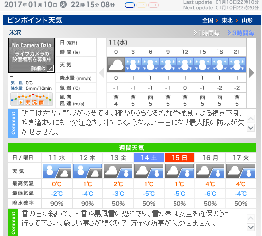「明日(11日のことね)は大雪に警戒が必要です。積雪のさらなる増加や強風による視界不良、吹き溜まりにも十分注意を。凍てつくような寒い一日になり最大限の防寒が欠かせません。」って。 ほらね。