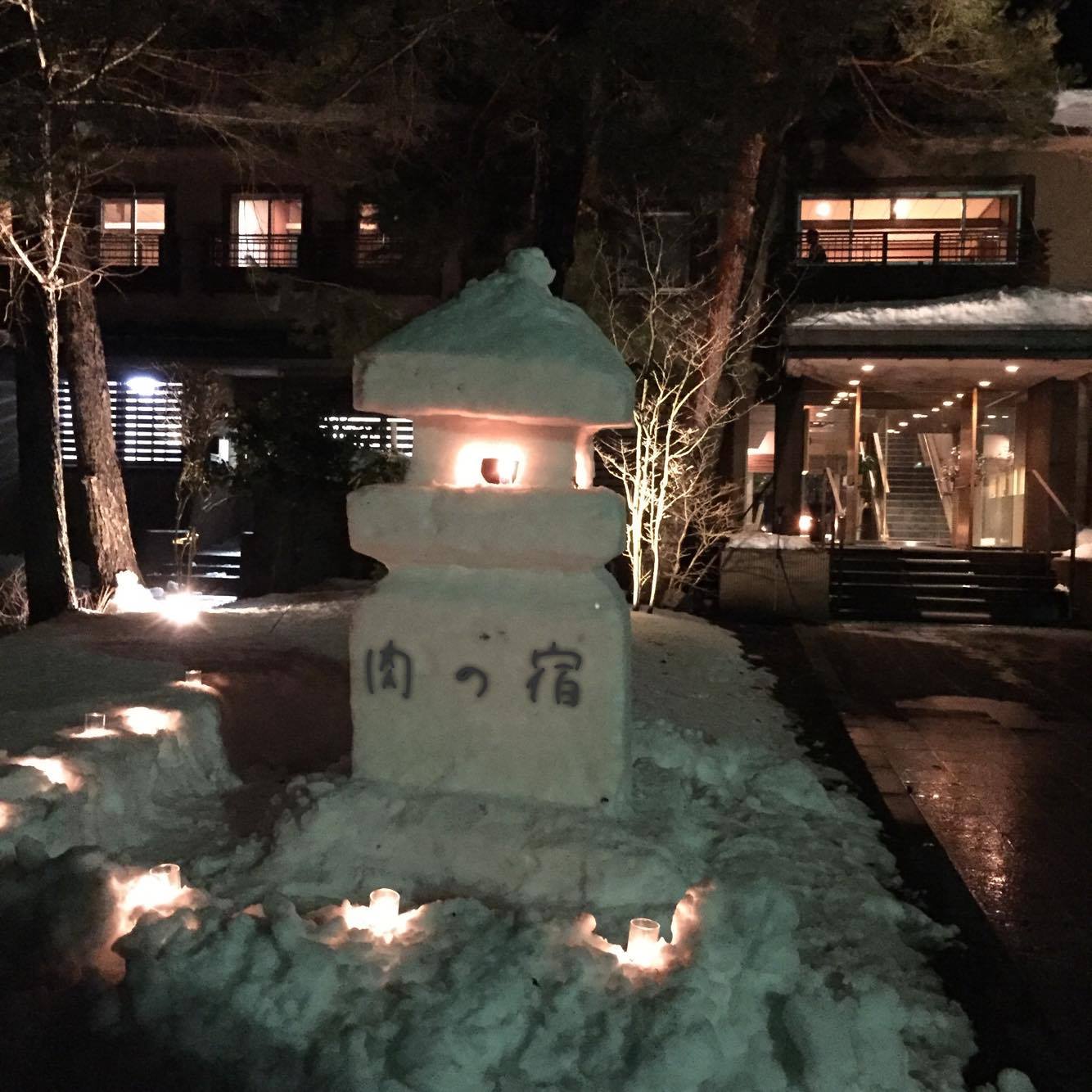 お宿の雪灯篭は あらかじめ太めにしていてくれたこともあってか まだしっかりとしてますが せめて 明日までは なんとか~って。 そういう気持ちです。