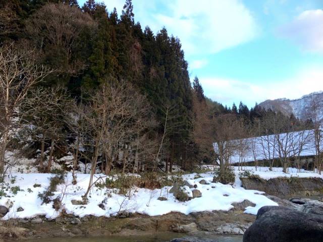 この景色 お宿の貸切露天風呂からの眺めですが 川の向こう岸の雪