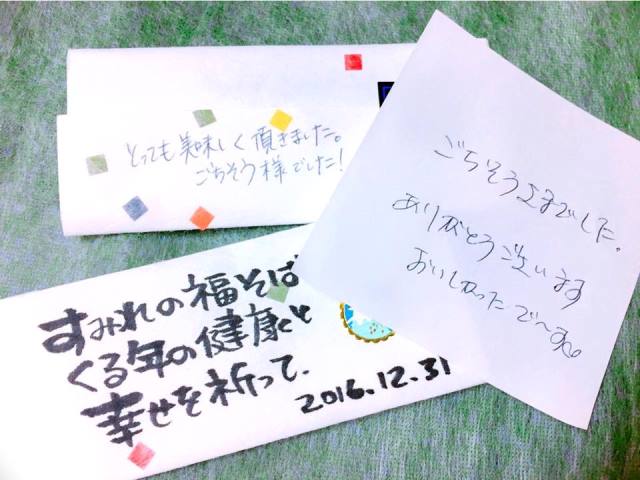 昨日ね、年越しそばを お部屋にお運びして 器を下げさせてもらった際に 手作りの箸袋の裏や別の紙にお客さまが「ごちそうさま」って 書いてくれていたんですよね~^^