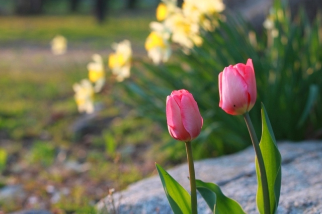 昨日はまだ つぼみだった チューリップが ふたつ 咲いて。