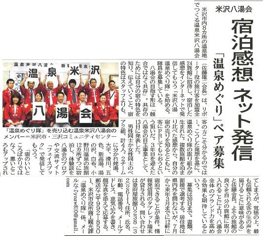 先日、米沢の八つの温泉で結成された「温泉米沢八湯会」が 2名二組で24軒のお宿に宿泊していただく体験リポーターを募集していることをこのブログでご案内させていただきましたが(前回の「米沢八湯 温泉めぐり隊!」隊員募集の記事はこちら♪)その後、山形新聞にもそのことが掲載されたようで仲間が知らせてくれたんですよ!それがこの記事。