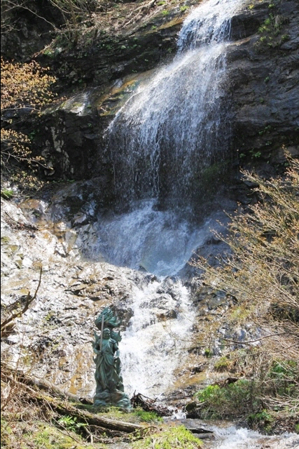 滝の中ほどにある ブロンズのお不動様は 昭和54年11月8日に 祖父が前身の旅館「健康の宿 すみれ荘」を創業する以前に 関根地区の方々などのご協力を得ながら寄進させていただいたという経緯があり 当時「大滝不動尊開眼法要」が入魂式として 米沢市長や関根区民の方々も参列し盛大に挙行されたと聞いています。