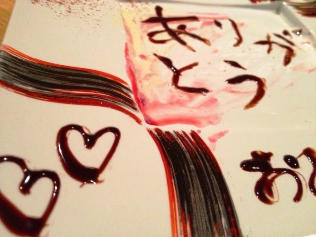 先日のことですが お誕生日のお祝旅行のご夫妻がいらしてくださったんですが お二人ともお誕生日が近かったことから ご夕食後にお祝いをさせていただいたんです。そしたらね、お召し上がりいただいたデザート皿に「ありがとう」のメッセージが チョコレートで書かれてあったんです!!