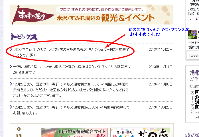 先日も チェックアウト後に 「ブログ見ました!ウフウフガーデン行ってきますね!」と お出かけになられたお客様がいらっしゃいましたが 「米沢の美味しいものコーナー」の近況は 嬉しいことに ご旅行の参考にしていただいているようなんですね!