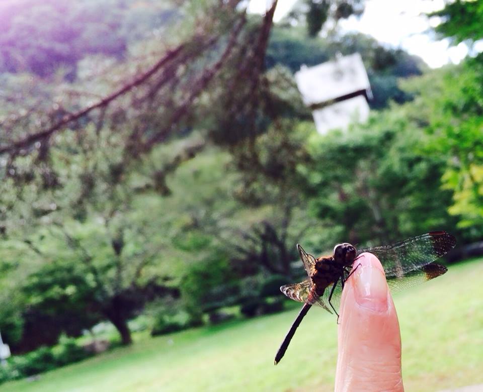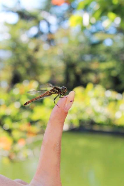 わたしがその方向を指で示したら なんと!その指先にトンボがとまったんです!