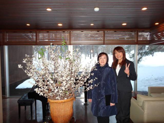 そんな啓翁桜が お宿のラウンジに活けられているのですが 生産者の「田んぼの花の里」後藤さんは 「咲かせるタイミングを計算して管理する準備が大変」と ご苦労をお話くださいましたが 苗木を植えてから収穫までに4年もの歳月が必要だそうで 生産者さんにとっては啓翁桜は 手塩をかけた愛情いっぱいの花木なんですよね~。