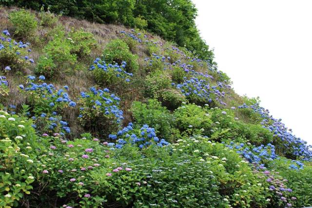 あじさいは 赤・青・紫・白など色とりどりで約3万株もある。