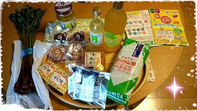 「スタンプラリー参加のお店でお土産として持ち帰ったものを全部写真に撮ってみました!!