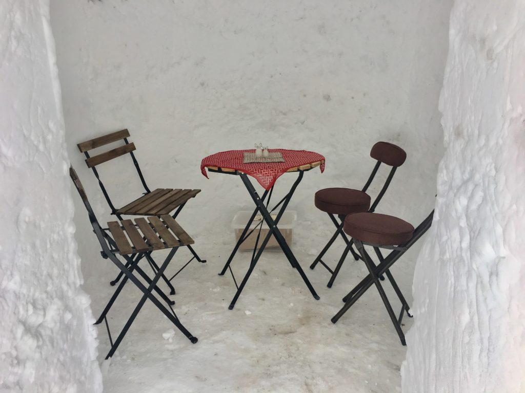 宿泊のお客さま対象のかまくらですが 一つしかないかまくらなので 4名まで入れるようにしたんですけど このかまくらでコーヒーや紅茶、スイーツだけでなくホットワインや熱燗まで(笑)飲食できるようにさせていただいたんですーー