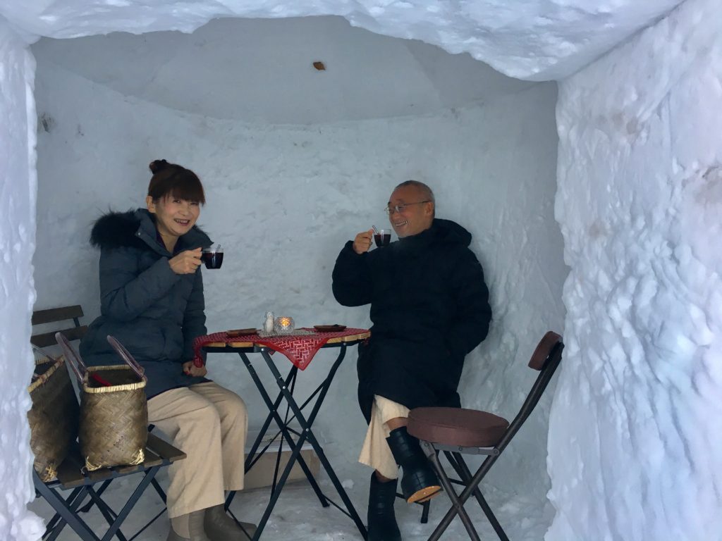 そして いつも館内のカウンターで湯上りワインを召し上がるお二人も 今回の冬のすみれのスタートはかまくらでホットワイン♪「わ~おいしいー」の笑顔がとっても嬉しかったなーー 楽しんでもらえてよかった~~って思いましたーー