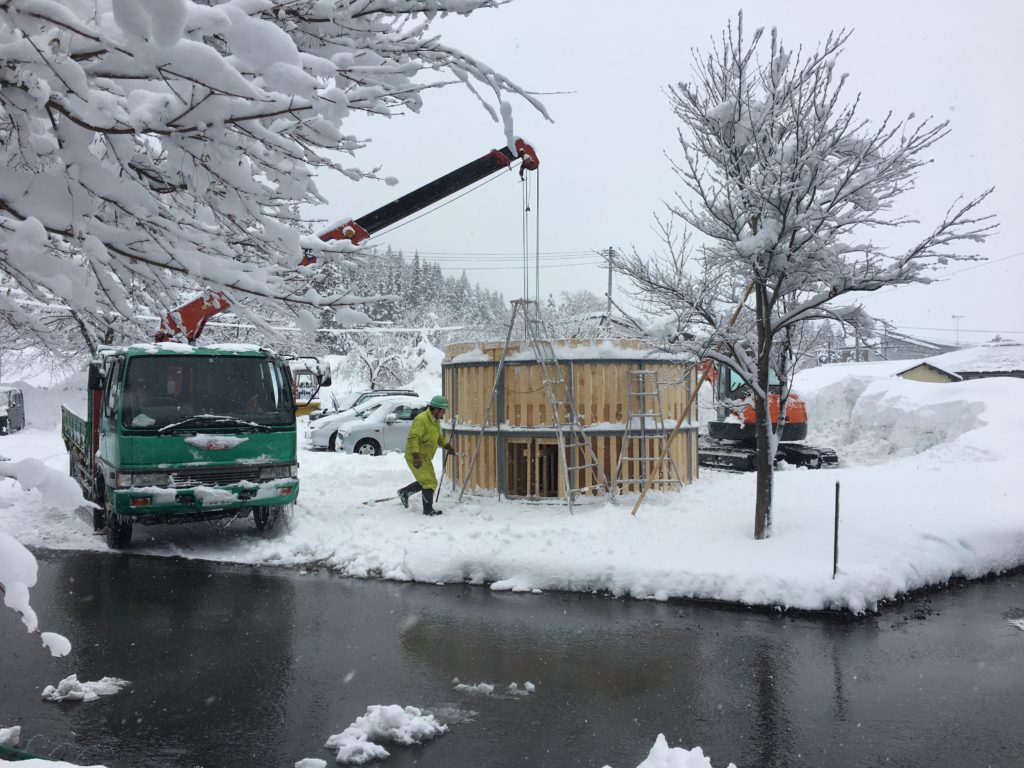 クレーンも飛び出し二枚の外枠と空洞を作るための内枠で作るかまくら。