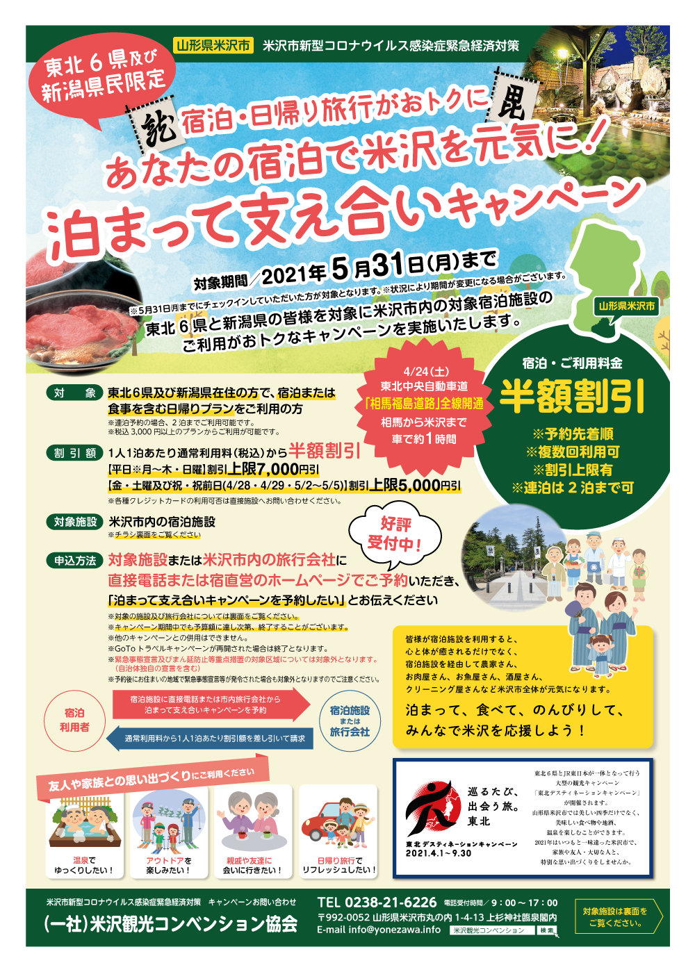 1.【米沢市】泊まって支え合いキャンペーン(5月31日まで)東北6県及び新潟県の方々にご利用いただけるキャンペーンです【ご予約受付中】※誠に恐れ入りますが宮城県のお客様はまだ対象外となりますのでご注意ください。