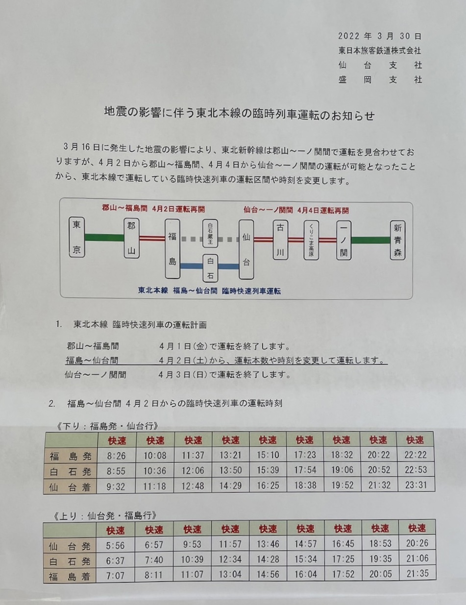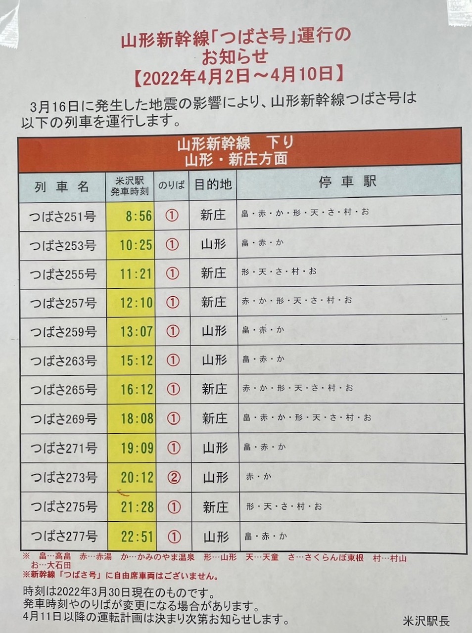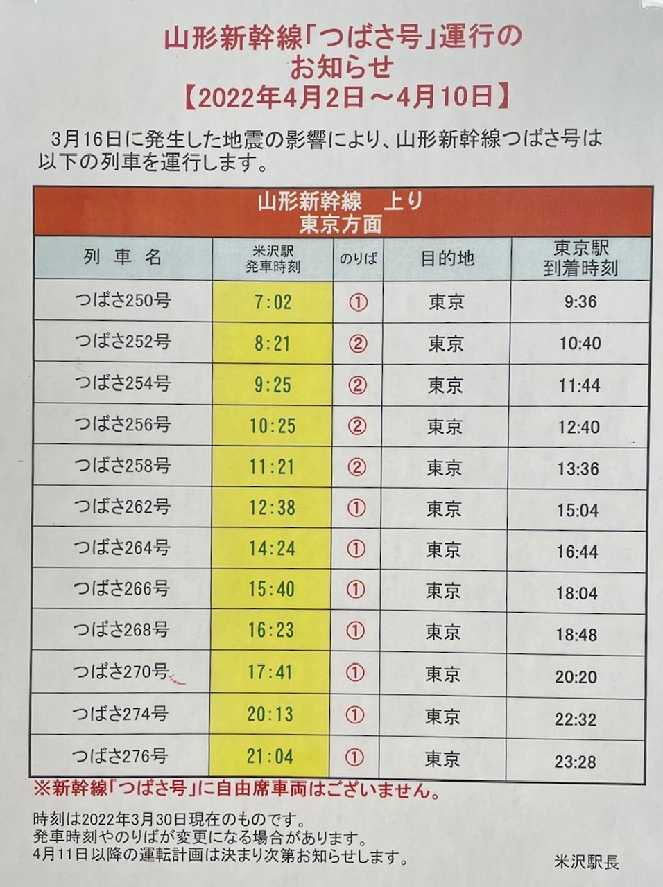 4月2日からの臨時ダイヤ 東京駅ー米沢駅間 山形新幹線の運行について【4/1交通情報】
