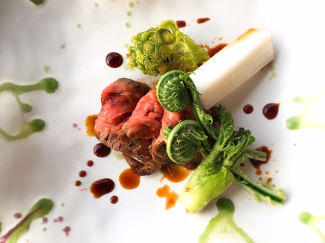 写真の お料理は4品目です。 米沢牛のフィレに近い脇腹部分の「かいのみ」という部位をローストにし 素揚げしたふきのとうや タラの芽、茹でたこごみや 山ウドを添えました。