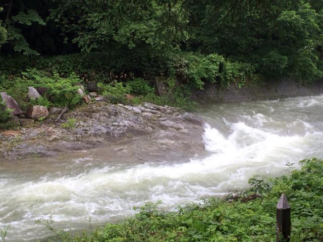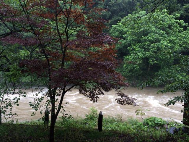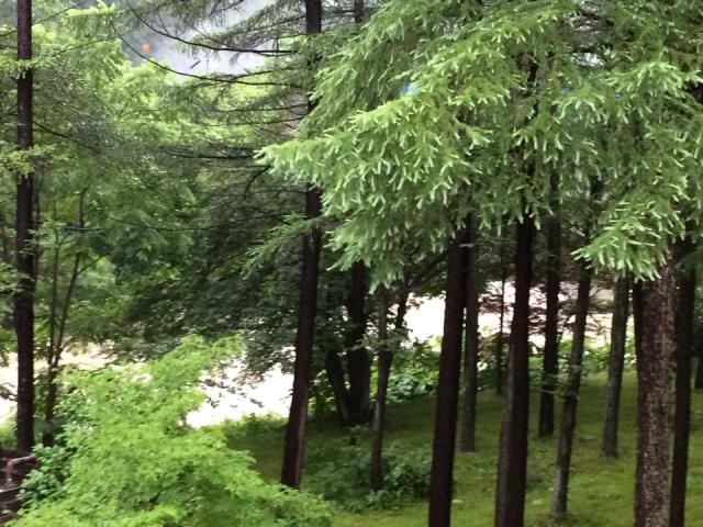 みるみるうちに すぐ横を流れる赤石川が増水していき 二階の「あかね」のお部屋から見てみたら、だいぶ荒々しい流れとなっていました。
