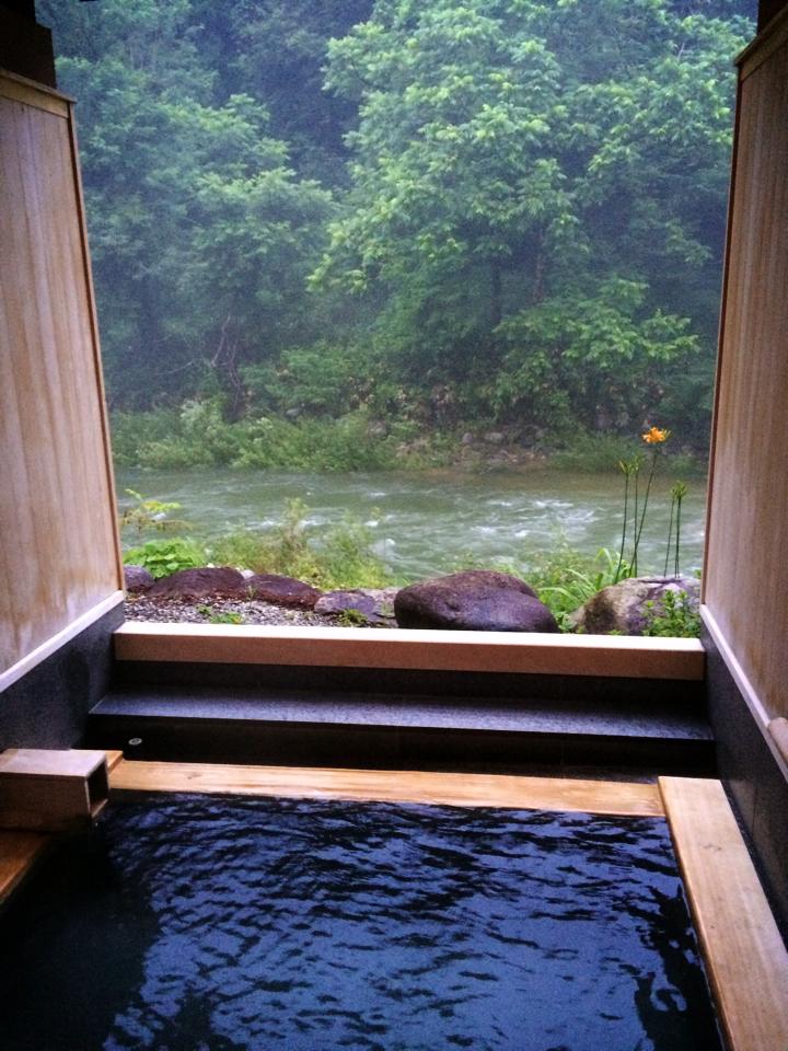 でもね、今日はすっかり落ち着いたようで内風呂の露天風呂から見える川や