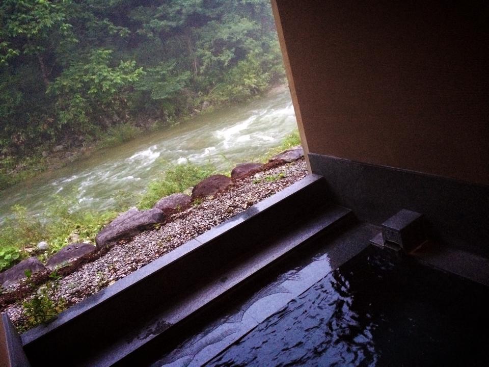 貸切露天風呂から見える川は、流れは速いものの いつもと変わらなくなっていました!