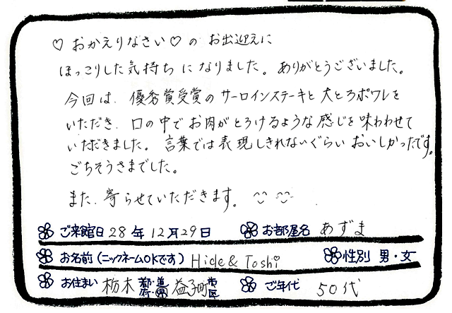 平成28年12月29日 「あずま」 ご宿泊