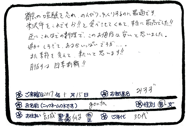 米沢牛をこれでもか!!と食べさせてくれて、本当に最高でした!!逆にこれほどの料理でこのお値段は安いと思いました。追加しすぎておなかいっぱいですが・・・。