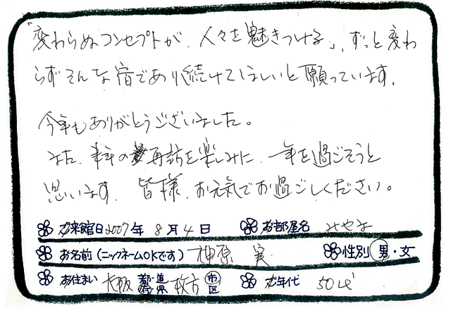 「変わらぬコンセプトが、人々を魅きつける」、ずっと変わらずそんな宿であり続けてほしと願っています。