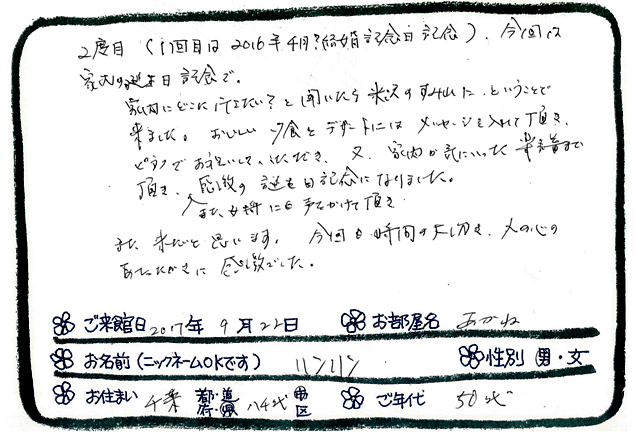 平成29年9月22日 「あかね」 ご宿泊