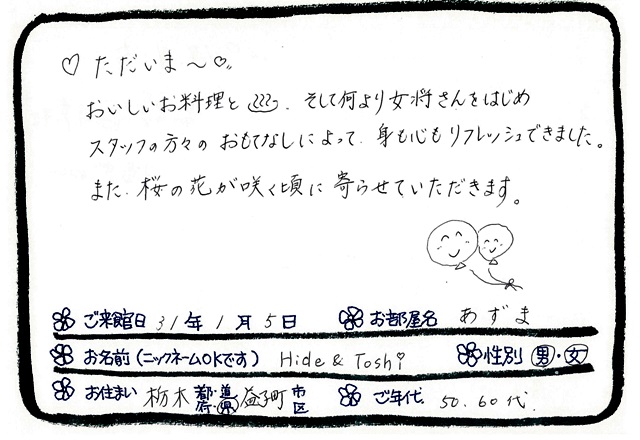 平成31年1月5日 「あずま」 ご宿泊