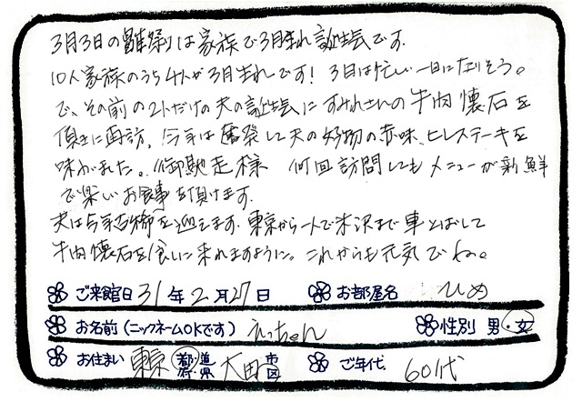 夫は今年古稀を迎えます。東京から一人で米沢まで車とばして牛肉懐石を食しに来れますように。これからも元気でね。