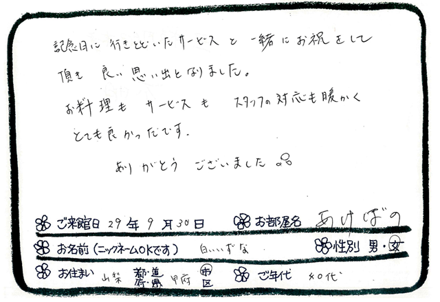 「記念日に 行きとどいたサービスとお祝いをして頂き良い思い出になりました♪」