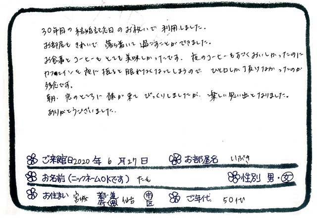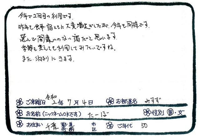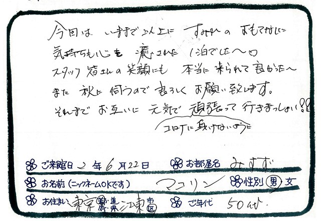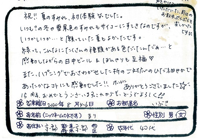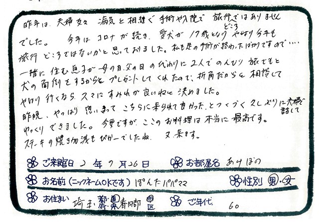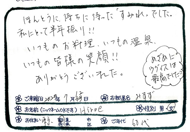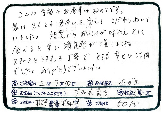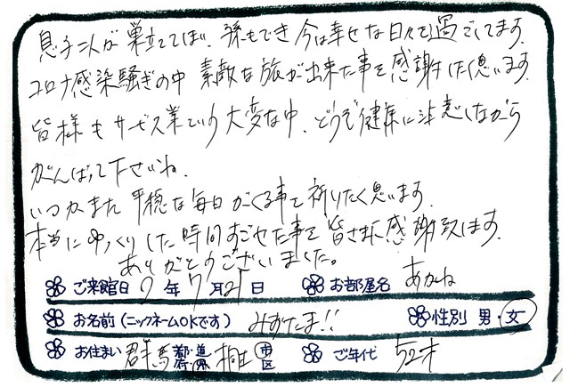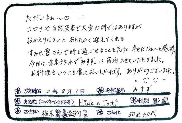 「今まで以上にすみれのおもてなしに気持ちも心も癒されました♪」日