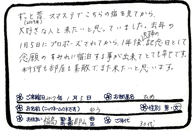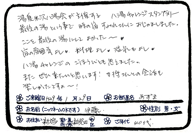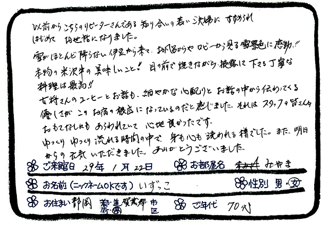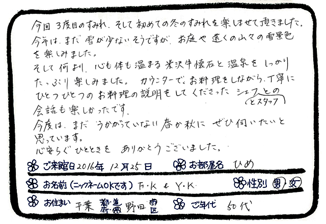 「TVや新聞で見て、念願かなって宿泊できて本当に良かった♪」米沢