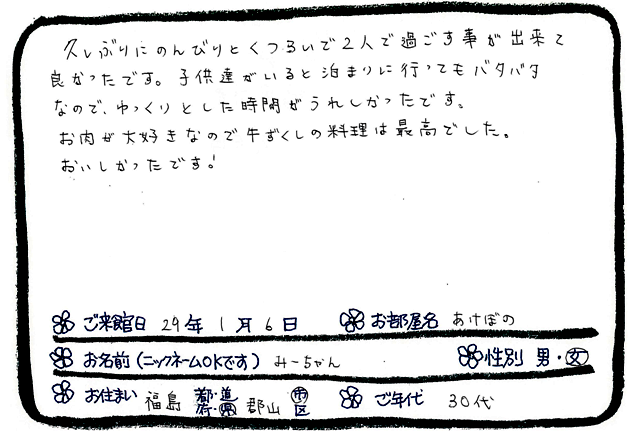 「久しぶりに夫婦二人っきりでのんびり出来ました♪」米沢牛づくし料