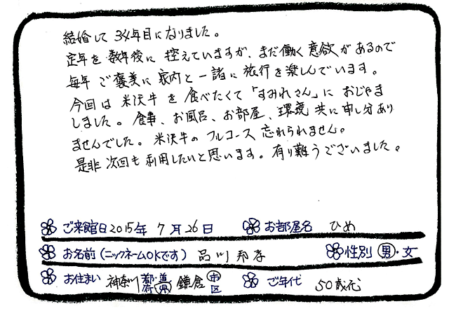 「二年目の結婚記念日で♪お目当ての米沢牛懐石料理に感動」ゆったり